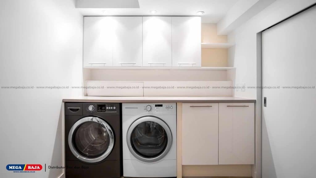 Jika kamu menggunakan mesin pengering (dryer), kamu bisa menempatkannya di atas mesin cuci dengan rak susun khusus laundry stacker atau sejajar di samping untuk efisiensi ruang dan ergonomi kerja.